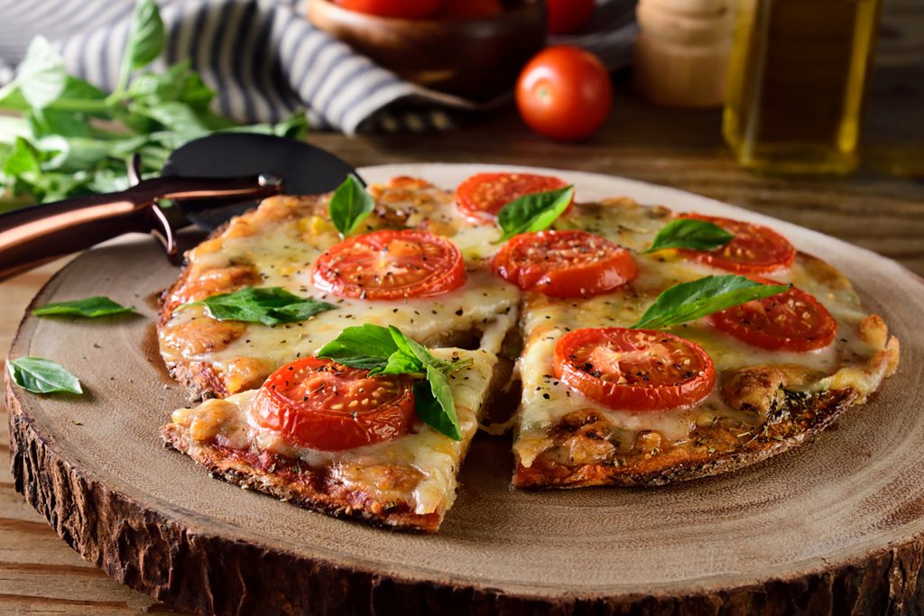 Masa a base de coliflor, salsa de tomate, queso mozarella e ingredientes al gusto.