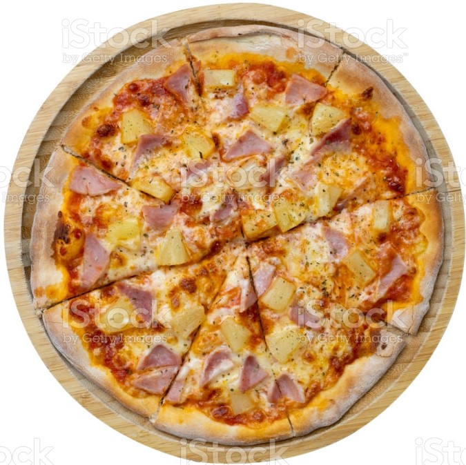 Jamón de cerdo curado como ingrediente principal, acompañado de tomates, champiñones y aceitunas negras.