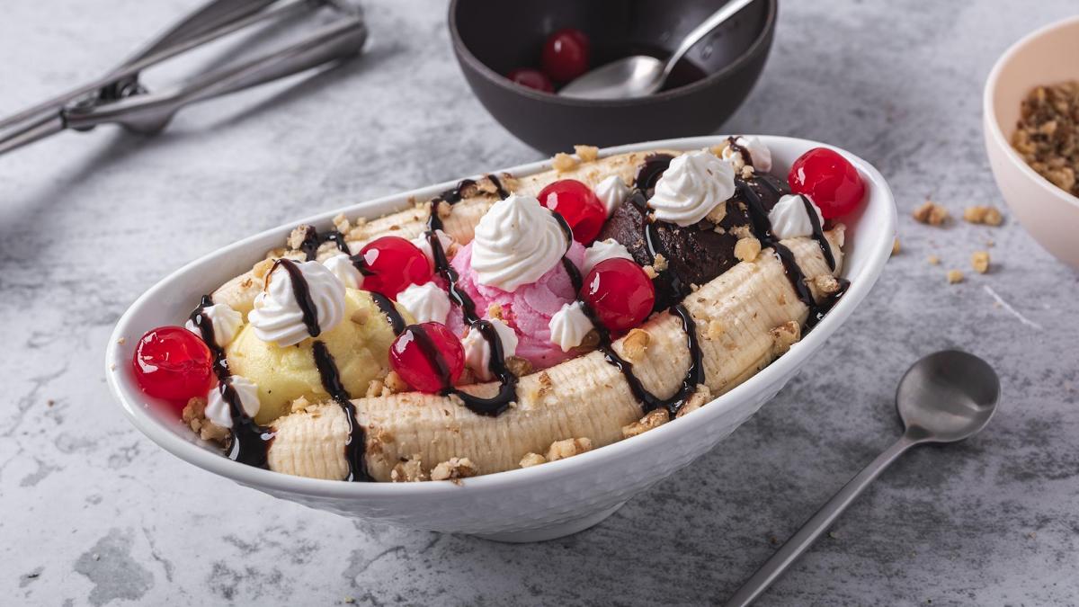Platano y bolas de helado sabor vainilla, chocolate y fresa con glaseado de caramelo, chocolate, crema batida, nueces y cereza.
