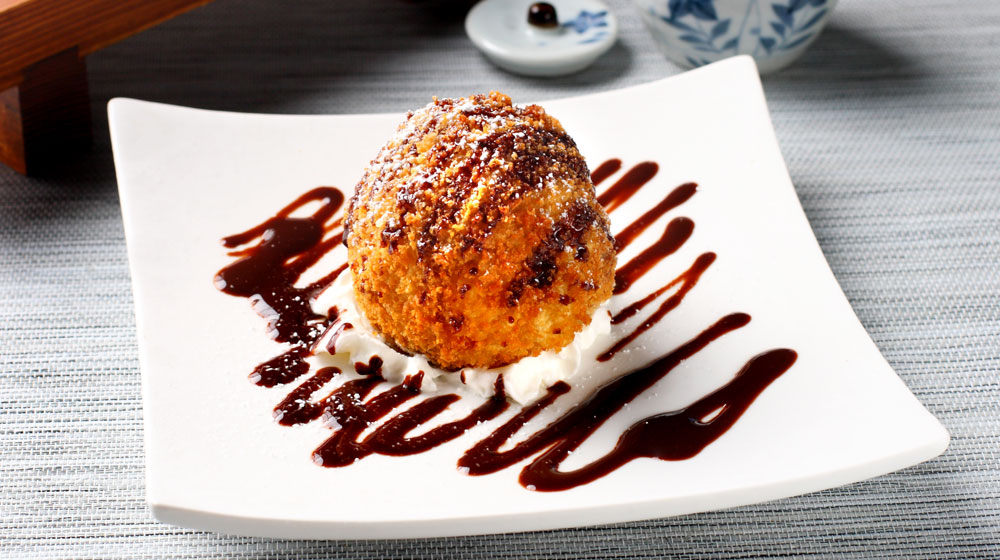 Rollo fino de masa con un relleno de manzanas, pasas y canela molida, acompañado de helado de vainilla o nata.