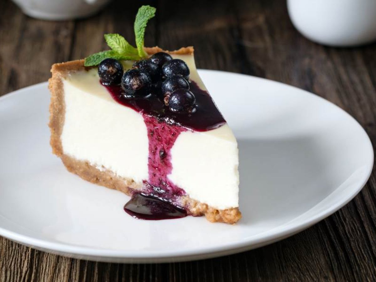 Postre frío a base de capas de galletas de vainilla con una tarta de queso y en su superficie una salsa de arandanos.